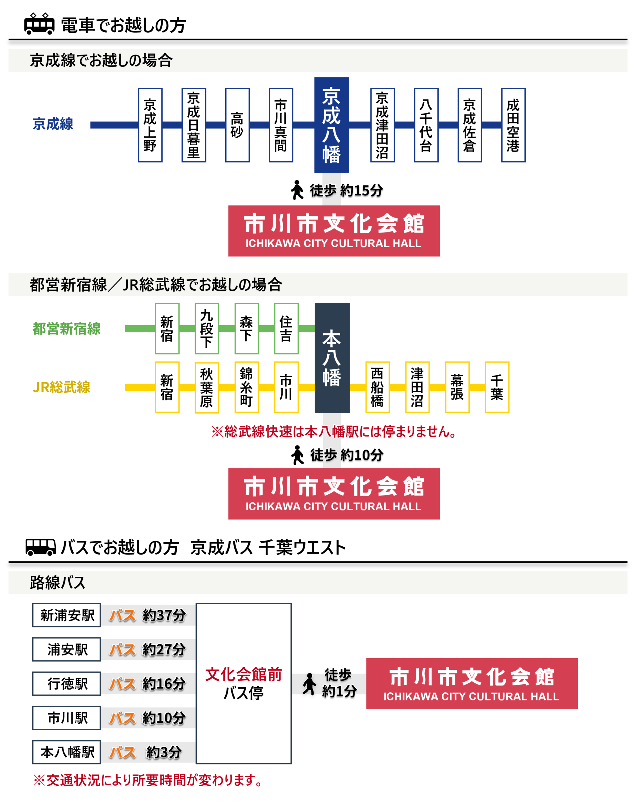 行徳方面からお越しの方は、本八幡駅行のバス「文化会館前」下車